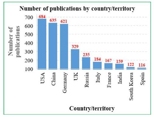 在理論研究方面,卡塔爾大學(xué)工程學(xué)院學(xué)者Ahmad K. Sleiti在2022年通過(guò)研究發(fā)現(xiàn),數(shù)字孿生技術(shù)在能源行業(yè)中的研究成果依舊集中在經(jīng)濟(jì)發(fā)達(dá)地區(qū),其中歐盟地區(qū)發(fā)表成果最多。據(jù)下列圖表顯示,歐盟地區(qū)(德國(guó)、意大利、法國(guó)、西班牙)研究成果整體數(shù)量高于美國(guó)、中國(guó)、英國(guó)以及俄羅斯國(guó)家等國(guó)家,占據(jù)全球第一位。