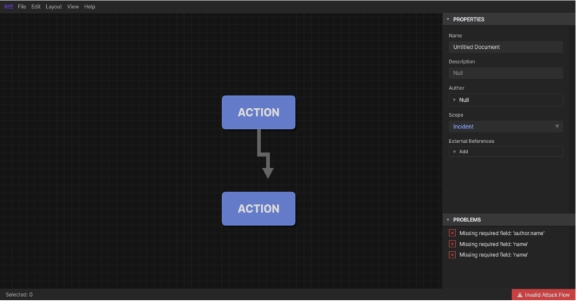 2.攻擊鏈建模編輯器:在瀏覽器中運行,幾分鐘內(nèi)便可完成攻擊流程的創(chuàng)建。該編輯器提供了一個工作空間,用戶可以輸入攻擊行動及其他背景信息,通過繪制箭頭,用戶可將這些信息編織成一個攻擊流程,明確展示事件或活動中觀察到的攻擊技術執(zhí)行順序。