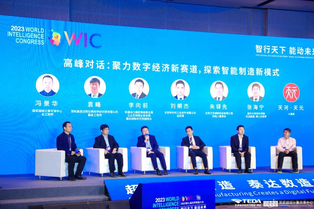 高峰對話環節由國家超級計算天津中心總工程師馮景華主持,圍繞“聚力數字經濟新賽道,探索智能制造新模式”主題展開探討。國機集團沈陽儀表科學研究院有限公司副總工程師袁峰;軟通動力集團高級副總裁,工業互聯網業務總裁,集團創新研究院副院長、李向前;北京和利時工業軟件有限公司總經理、劉桐杰;北京蘭光創新科技有限公司創始人、董事長,朱鐸先;南開大學軟件學院、杰出教授、博士生導師、張海寧;以及神秘的 AI 嘉賓-天河·天元,現場共話智能制造新模式,推動數字經濟發展。