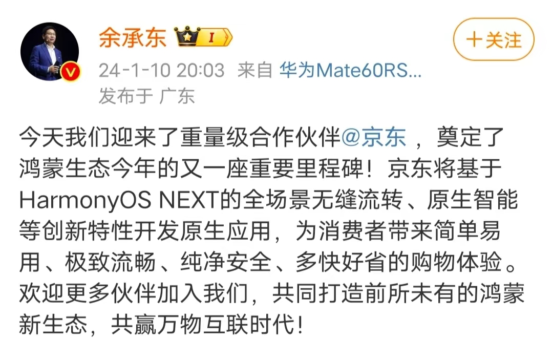 華為常務董事、終端業務CEO、智能汽車解決方案BU董事長余承東在微博發文稱:“今天我們迎來了重量級合作伙伴京東,奠定了鴻蒙生態今年的又一座重要里程碑!