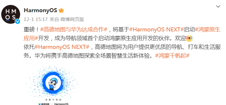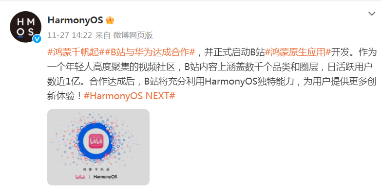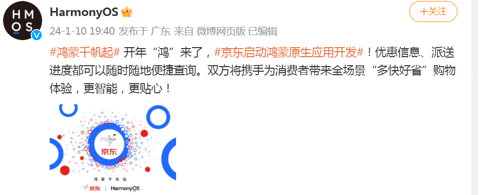 1月10日晚,HarmonyOS微博發文稱:京東啟動鴻蒙原生應用開發,雙方將攜手為消費者帶來全場景“多快好省”購物體驗,更智能,更貼心。