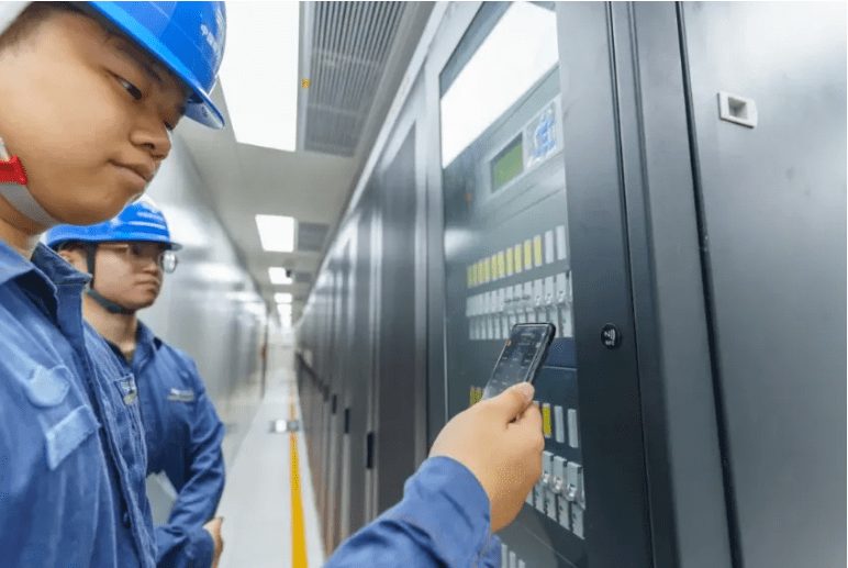 深圳供電局基于開源鴻蒙自主研制通信機(jī)房數(shù)智運維系統(tǒng),提高了機(jī)房智能管理水平。圖為供電人員使用鴻蒙手機(jī)“碰一碰”機(jī)房設(shè)備,就能掌握該設(shè)備實時數(shù)據(jù)。(黃海鵬攝)