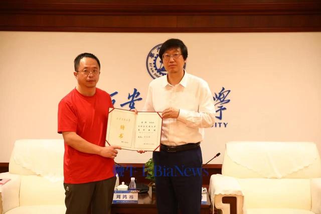 在周鴻祎校友兼職教授授聘儀式上,西安交大校長張立群為周鴻祎頒發了聘書,并為他佩戴?;?。