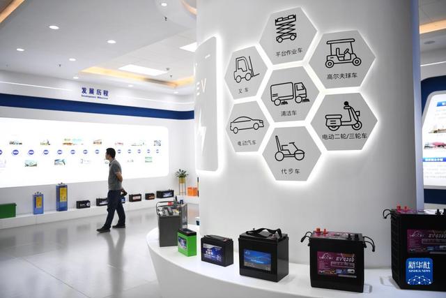 10月9日,參觀者在廣東肇慶理士電源技術有限公司觀看各種類型的電池產品。