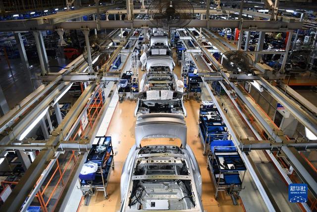 10月9日,工作人員在廣東肇慶小鵬汽車智能網聯科技產業園內的總裝生產線上工作。