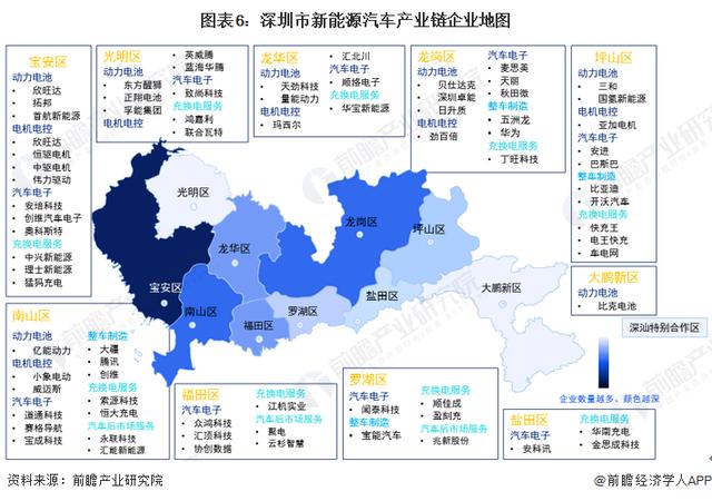 從產業鏈各環節的代表性企業分布地圖來看,目前深圳市各轄區均有汽車電子、充換電環節的企業分布,而新能源整車制造代表企業主要分布在坪山區、南山區和龍崗區。相對而言,南山區、坪山區、龍崗區和寶安區的產業鏈布局更完善。