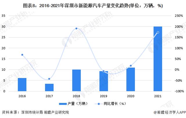 近年來,深圳市新能源汽車產業發展迅猛。2018-2020年,深圳市新能源汽車產量維持在9萬輛/年以上,2020年突破了10萬輛;2021年,深圳市新能源汽車產量逼近30萬輛,同比增長174%;同時,在新能源汽車的有效推廣下,全市公交出租均已實現電動化,2021年全市新能源汽車銷量14.48萬輛,占當年汽車銷量比重超40%。