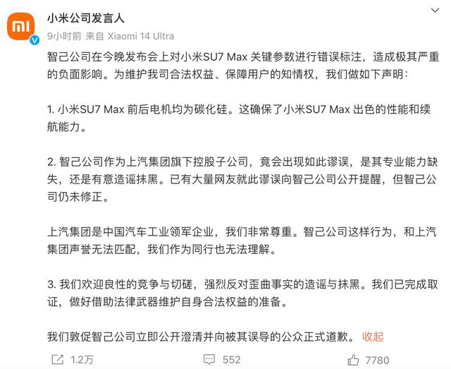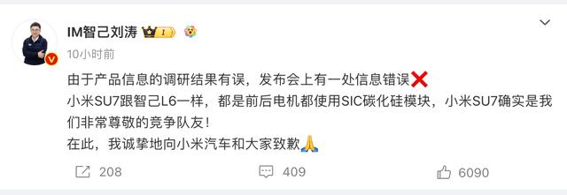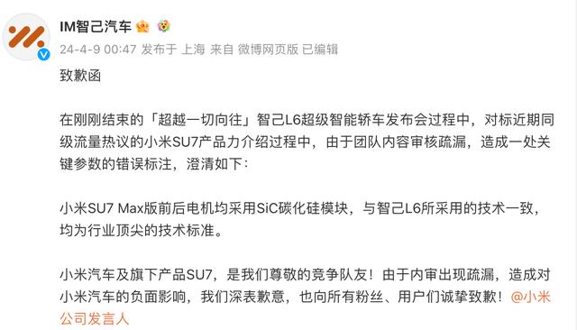 約半小時(shí)后,智己汽車(chē)終于在官方微博作出回應(yīng)稱(chēng),在剛剛結(jié)束的智己L6超級(jí)智能轎車(chē)發(fā)布會(huì)過(guò)程中,對(duì)標(biāo)近期同級(jí)流量熱議的小米SU7產(chǎn)品力介紹過(guò)程中,由于團(tuán)隊(duì)內(nèi)容審核疏漏,造成一處關(guān)鍵參數(shù)的錯(cuò)誤標(biāo)注,澄清如下:小米SU7 Max版前后電機(jī)均采用SIC碳化硅模塊,與智己L6所采用的技術(shù)一致,均為行業(yè)頂尖的技術(shù)標(biāo)準(zhǔn),“小米汽車(chē)及旗下產(chǎn)品SU7,是我們尊敬的競(jìng)爭(zhēng)隊(duì)友!由于內(nèi)審出現(xiàn)疏漏,造成對(duì)小米汽車(chē)的負(fù)面影響,我們深表歉意,也向所有粉絲、用戶(hù)們誠(chéng)摯致歉!”
