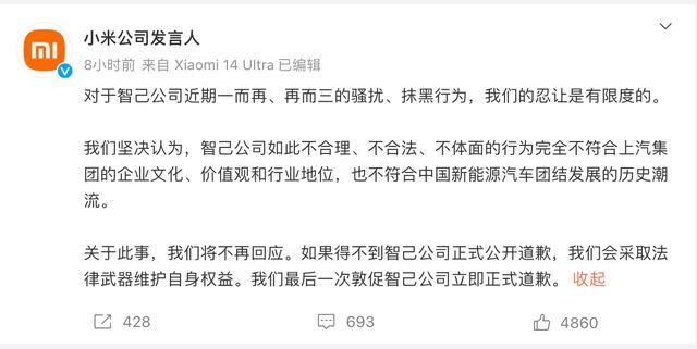或是前兩條微博未能引起智己重視,4月9日凌晨,小米公司發(fā)言人官微向智己發(fā)出最后通牒,“對(duì)于智己公司近期一而再、再而三的騷擾、抹黑行為,我們的忍讓是有限度的。”