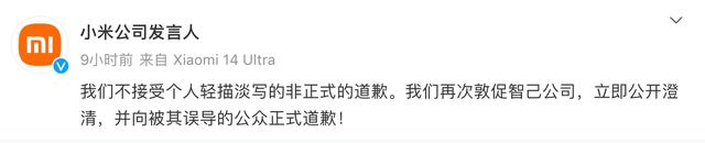 小米方面強(qiáng)調(diào),“關(guān)于此事,我們將不再回應(yīng)。如果得不到智己公司正式公開(kāi)道歉,我們會(huì)采取法律武器維護(hù)自身權(quán)益。我們最后一次敦促智己公司立即正式道歉。”