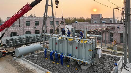 國網石家莊供電公司工作人員對220千伏安托變電站主變進行更換作業。胡國秋攝