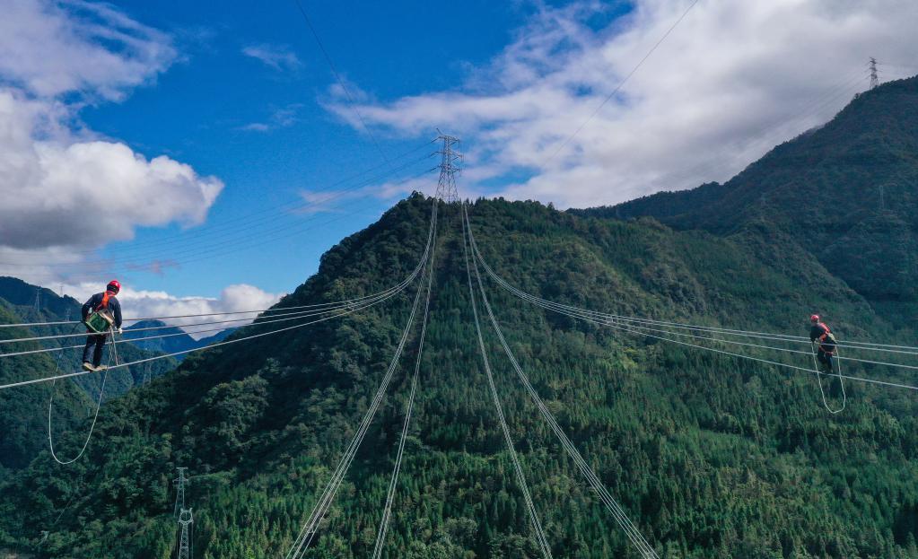 10月18日,在四川省雅安市天全縣喇叭河鎮,技術人員在導線上進行質檢工作(無人機照片)。新華社記者 王曦 攝