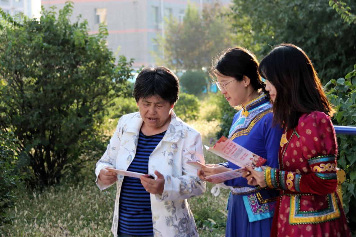 活動中,黨員同志們集中開展黨的民族理論政策宣傳,生動形象闡述民族團結、“三個離不開”、“四個不動搖”等民族政策,進一步增強社區居民對中華民族這一共有身份的認同感、歸屬感和責任感,拉近各民族情感,凝聚民族團結進步正能量。生動有趣的活動現場吸引了社區里眾多群眾的廣泛參與,身著蒙古族服飾的宣講員在夕陽的映射下顯得格外美麗。