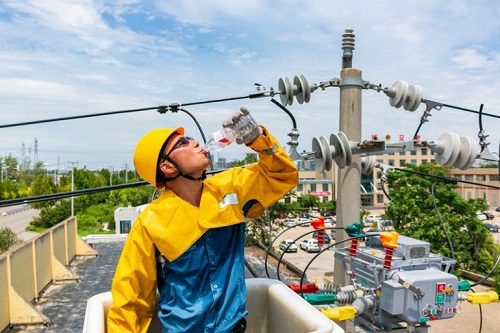 國網山東濟寧供電公司員工在烈日高溫下完成智能開關更換作業后補充水分。