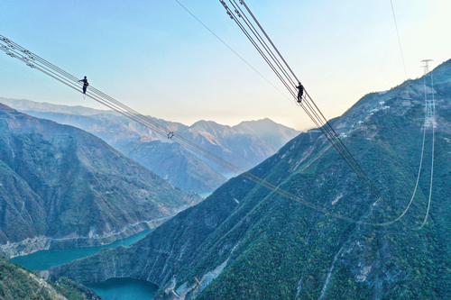 國網四川電力員工在白鶴灘—浙江特高壓工程施工現場展放導線。