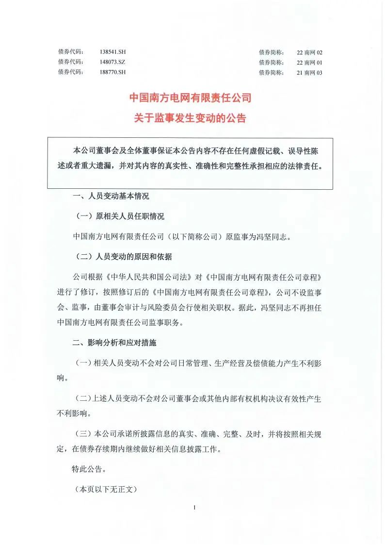 2月11日,中國南方電網有限責任公司發布關于監事發生變動的公告。公司根據《中華人民共和國公司法》對《中國南方電網有限責任公司章程》進行了修訂,按照修訂后的《中國南方電網有限責任公司章程》,公司不再設監事會、監事,由董事會審計與風險委員會行使相關職權。據此,馮堅同志不再擔任中國南方電網有限責任公司監事職務。