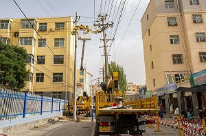 在現場,地勤人員進行路障、警示牌與圍欄等安全防護設置,帶電作業人員乘坐絕緣斗臂車到達作業位置,對線路進行帶電作業,通過新建臨時電桿,將“占道電桿”分支線路所有負荷轉供,為接下來的不停電“零感知”地下遷移工作打下基礎。“這次的項目不僅可以拆除‘占道電桿’,同時對年久雜亂的線路‘蜘蛛網’還可以進行集中整理,既美化了市容市貌,又解決了線路存在的安全隱患。”現場負責人張偉說。目前,該項工程正根據工程計劃有序進行,計劃在11月底完工,徹底解決車輛通行安全隱患,暢通“惠民路”讓廣大居民用電無憂、安全出行。