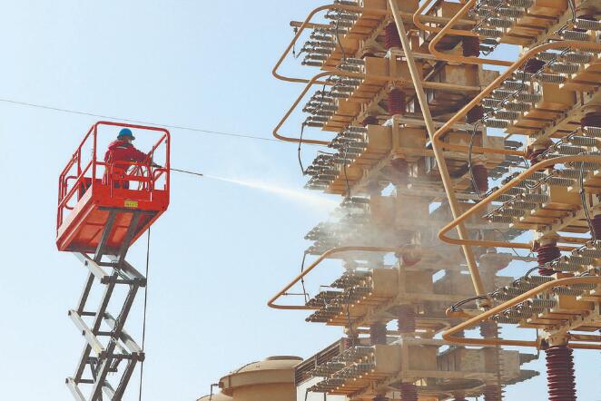 黨員突擊隊隊員在±800千伏靈州換流站年度檢修現場沖洗交流濾波器。