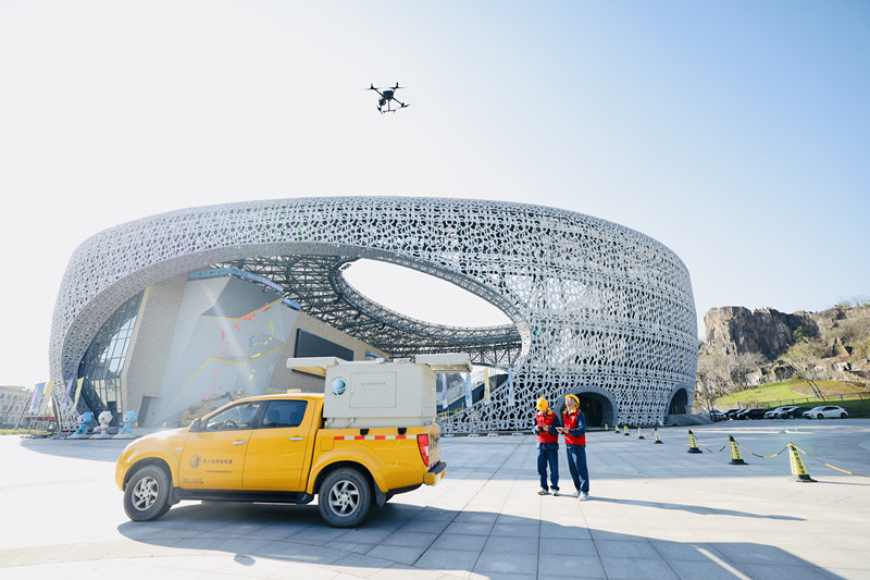 ▲國網(wǎng)浙江紹興供電公司應(yīng)用無人機(jī)對攀巖中心進(jìn)行智能巡檢