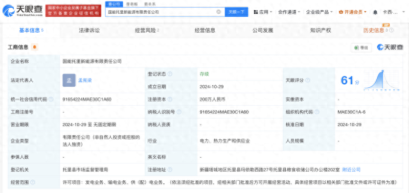 據天眼查顯示,國能托里新能源有限責任公司于近日成立,注冊資本200萬元,經營范圍為發電業務、輸電業務、供(配)電業務。該公司由國家能源集團新疆能源有限責任公司全資持股,后者為國家能源投資集團有限責任公司全資子公司。