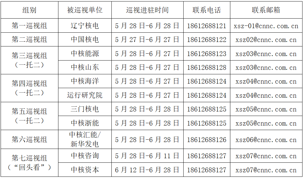 本輪巡視是中核集團黨組在深入學習貫徹習近平新時代中國特色社會主義思想特別是習近平總書記關于黨的自我革命的重要思想,貫徹落實新修訂的《中國共產黨巡視工作條例》,扎實開展黨紀學習教育之際,開展的一次重要政治監督。各巡視組將全面貫徹巡視工作方針,堅守政治巡視定位,以“兩個維護”為根本任務,聚焦黨中央決策部署,特別是習近平總書記重要講話和重要指示批示精神,以及中核集團黨組決策決議落實情況,深入查找政治偏差;緊盯權力和責任,加強對“一把手”的監督,持續強化巡視震懾作用;做深做實巡視“后半篇文章”,通過巡視“回頭看”,進一步壓緊壓實整改責任,推動巡視整改見真章、出實效。巡視期間設專門值班電話和電子郵箱,主要受理反映被巡視單位黨組織領導班子及其成員、下一級黨組織領導班子主要負責人和重要崗位中層干部問題的來信來電來訪,重點是關于違反政治紀律、組織紀律、廉潔紀律、群眾紀律、工作紀律和生活紀律等方面的舉報和反映,著力發現違反政治紀律和政治規矩、領導干部腐敗、群眾身邊不正之風、違反中央八項規定精神、干部不擔當不作為等突出問題,其他不屬于巡視受理范圍的信訪問題,將按規定交由相關部門處理。