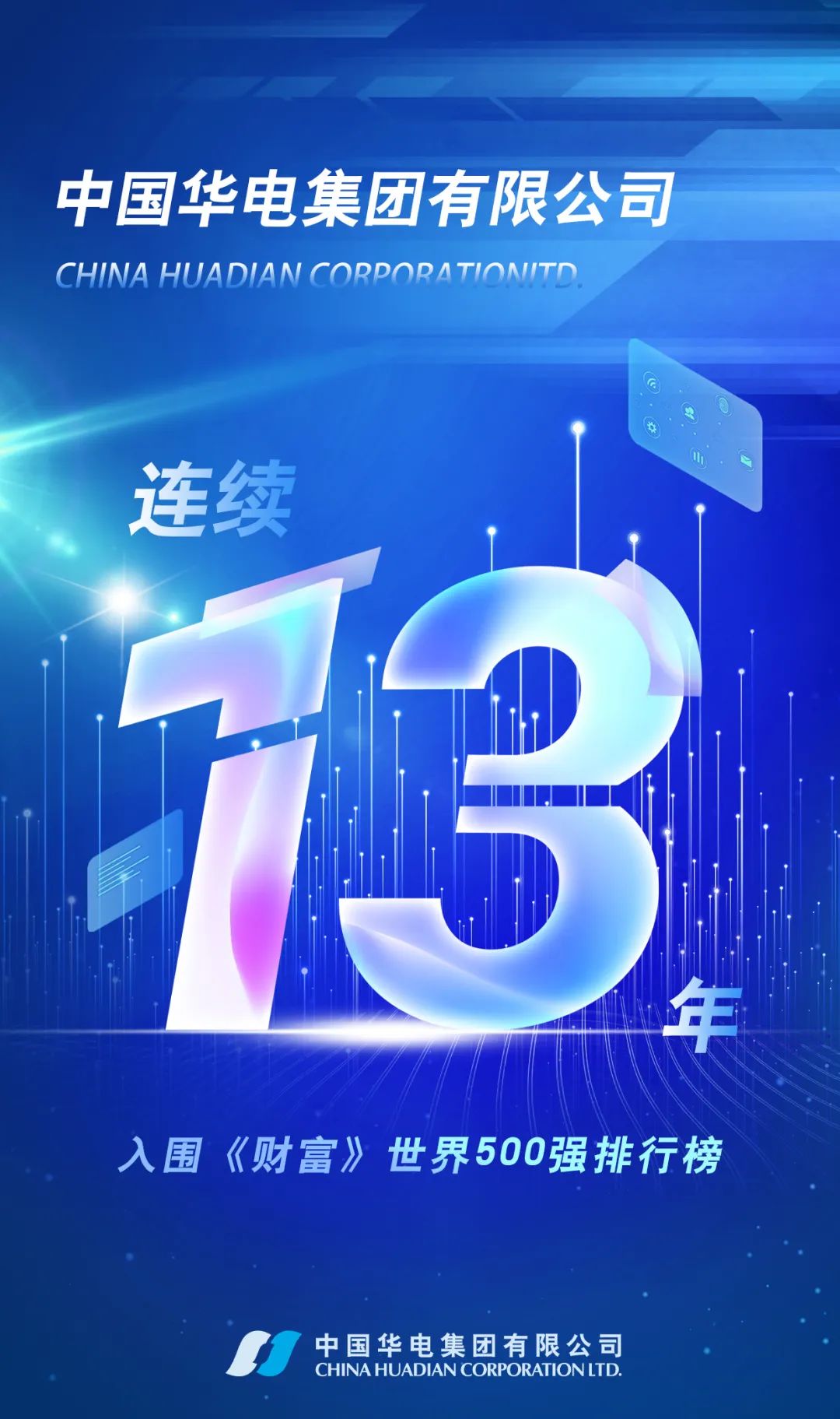 2024年8月5日,《財富》世界500強排名最新榜單發(fā)布,中國華電集團有限公司位列第336位,連續(xù)13年入圍榜單。