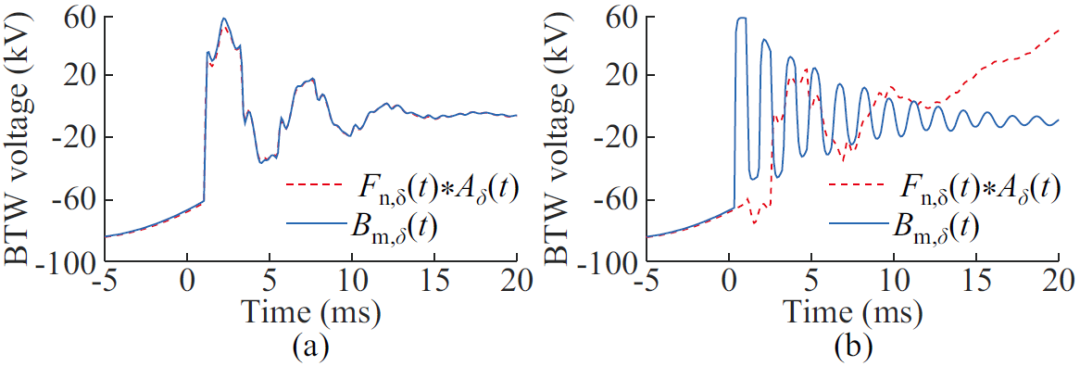 圖3 經(jīng)本端與對端模量信息計(jì)算的電壓反行波對比 (a) 區(qū)外故障 (b) 區(qū)內(nèi)故障