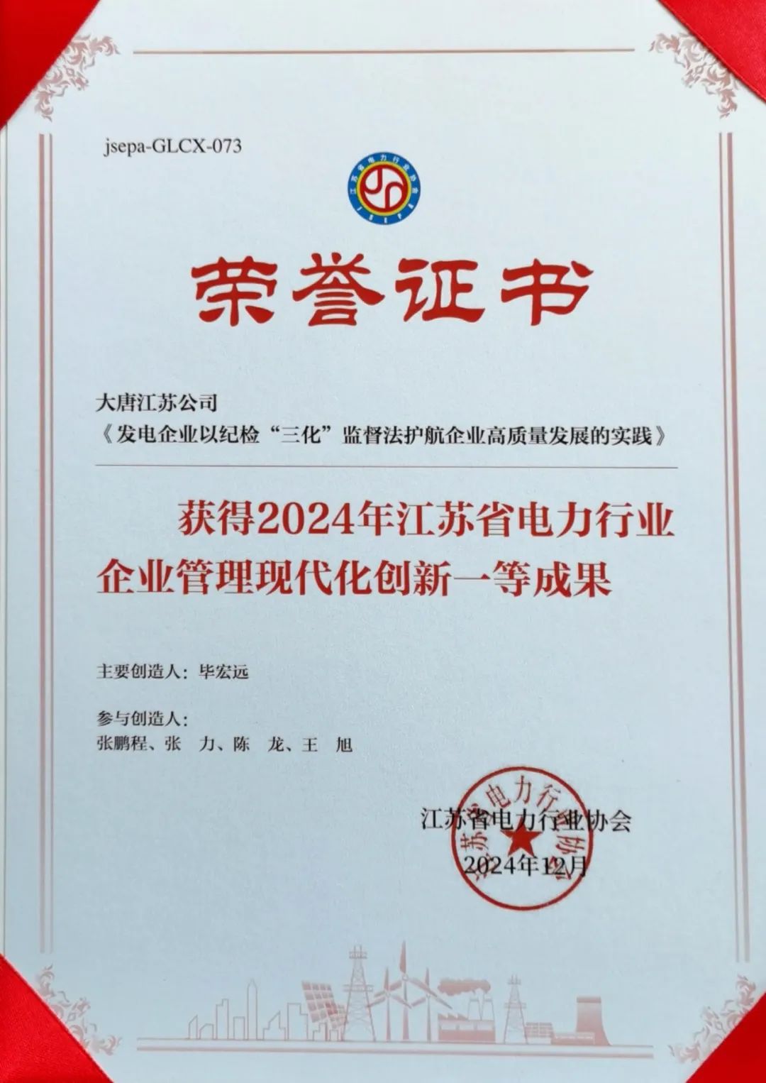 近期,江蘇公司紀委申報題為《發電企業以紀檢“三化”監督法護航企業高質量發展的實踐》案例榮獲2024年江蘇省電力行業企業管理現代化創新“一等成果”。
