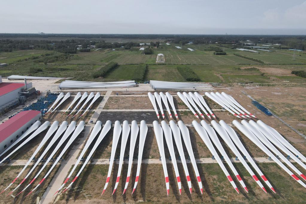 6月30日拍攝的河北省威縣一家風電機組葉片制造企業生產的大型風電機組葉片(無人機照片)。 新華社記者 駱學峰 攝