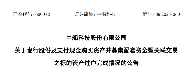 公告披露,截至本公告日,中船科技發行股份及支付現金購買資產并募集配套資金暨關聯交易之標的資產交割及過戶手續已辦理完畢。