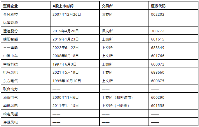 圖為中國風電整機商A股上市情況