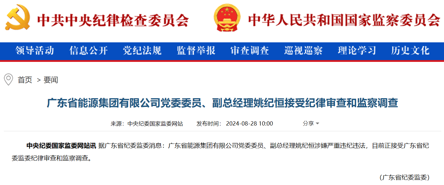 8月28日,中央紀委國家監委網站訊 據廣東省紀委監委消息:廣東省能源集團有限公司黨委委員、副總經理姚紀恒涉嫌嚴重違紀違法,目前正接受廣東省紀委監委紀律審查和監察調查。