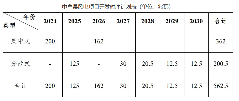 風電項目開發時序。全縣共規劃風電項目容量562.5兆瓦,開發時序計劃如下: