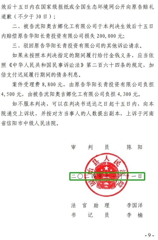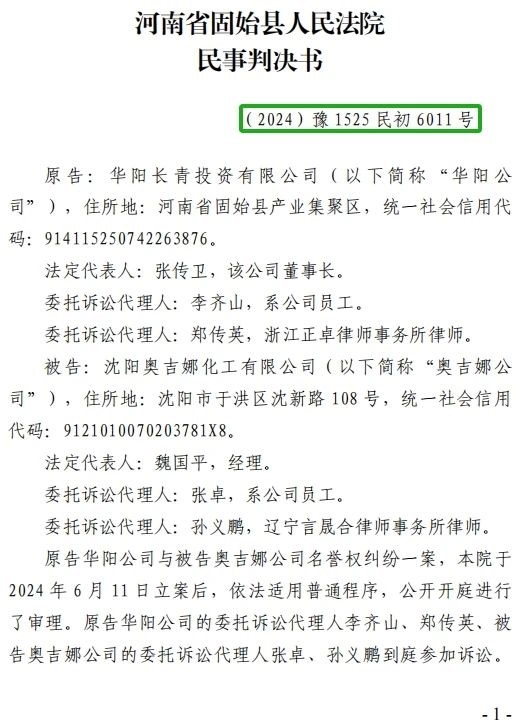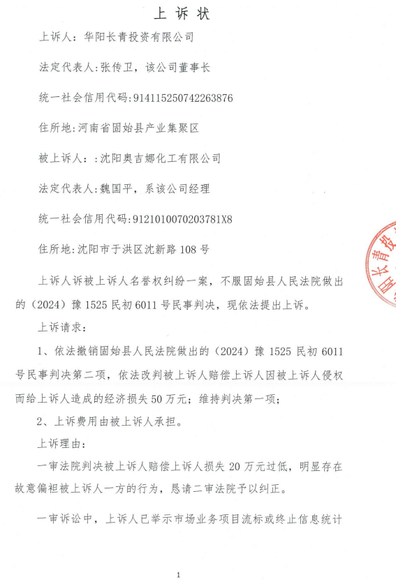 5、2024年10月30日,奧吉娜公司收到固始縣法院日期為2024年10月28日的《民事判決書》(2024)豫 1525 民初 6011 號。判決長青公司勝訴如下:“一、被告沈陽奧吉娜化工有限公司立即停止對原告華陽長青投資有限公司的舉報、投訴等名譽侵權行為,并于本判決生效后十五日內在國家級報紙或全國生態環境網公開向原告賠禮道歉(不少于 30 日); 二、被告沈陽奧吉娜化工有限公司于本判決生效后十五日內賠償原告華陽長青投資有限公司損失200,000 元; 三、駁回原告華陽長青投資有限公司的其他訴訟請求。 案件受理費8,800元,由原告華陽長青投資有限公司負擔4,500元,由被告沈陽奧吉娜化工有限公司負擔4,300元。”