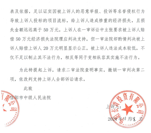 8、2024年11月18日,華陽長青公司提交《上訴狀》(依據第一個判決書,上訴已超時),請求“1、依法撤銷固始縣人民法院做出的(2024)豫1525 民初 6011號民事判決第二項,依法改判被上訴人賠償上訴人因被上訴人侵權而給上訴人造成的經濟損失50萬元;維持判決第一項;2、上訴費用由被上訴人承擔。”