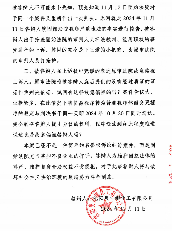 2、2024年6月16日,奧吉娜公司根據《中華人民共和國民事訴訟法》第二十二條的規定,向固始縣人民法院遞交《管轄權異議申請書》,請求法院依法將本案移送至被告奧吉娜公司所在地沈陽市于洪區人民法院審理。2024年6月26日,奧吉娜公司收到固始縣人民法院《河南省固始縣人民法院民事裁定書》(2024)豫1525民初6011號,裁定“駁回被告沈陽奧吉娜化工有限公司對本案管轄權提出的異議。”