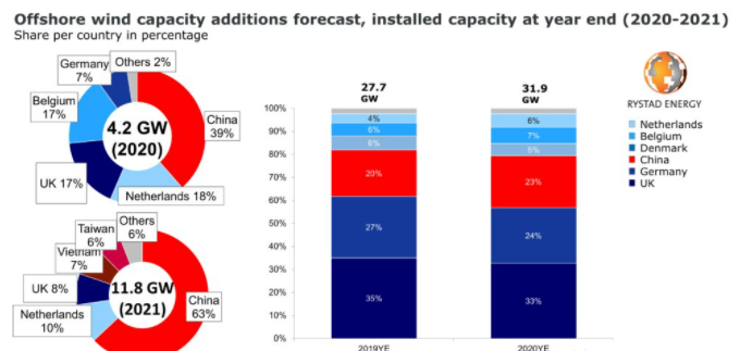 根據知名能源咨詢公司Rystad Energy數據統計,盡管受新冠疫情影響,2020年全球海上風電新增裝機4.2GW,同比增長15%,總裝機達到31.9GW。同時,該機構預測今年全球將新增裝機11.8GW,同比增長37%,最終裝機達到43.7GW。