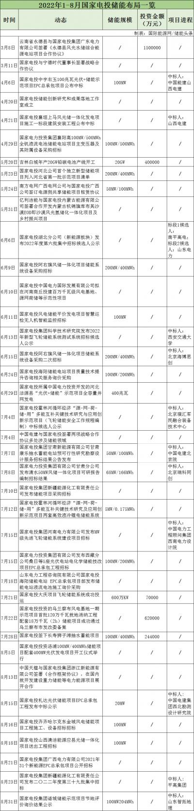 據不完全統計,2022年1-8月,國家電投與寧德時代、中國電建、中國天楹等簽訂合作協議,圍繞儲能材料、風光氫儲、重力儲能等方面進行合作。儲能項目招標26個,涉及飛輪儲能、液流電池、鉛炭電池、抽水蓄能及智慧新能源等方面。