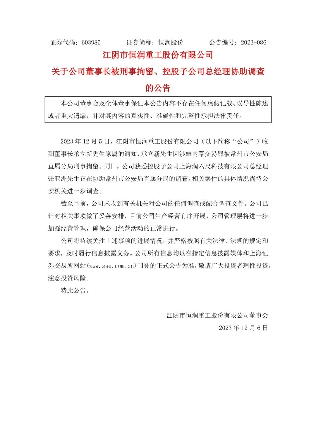 公告顯示, 2023 年 12 月 5 日,江陰市恒潤(rùn)重工股份有限公司(以下簡(jiǎn)稱(chēng)“公司”)收到董事長(zhǎng)承立新先生家屬的通知,承立新先生因涉嫌內(nèi)幕交易罪被常州市公安局直屬分局刑事留。同日,公司獲悉控股子公司上海潤(rùn)六尺科技有限公司總經(jīng)理張亞洲先生正在協(xié)助常州市公安局直屬分局的調(diào)查。相關(guān)案件的具體情況尚待公安機(jī)關(guān)進(jìn)一步調(diào)查。