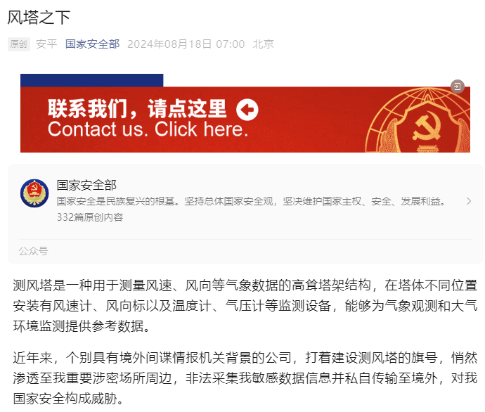 8月18日,據(jù)國(guó)家安全部官微消息,近年來(lái),個(gè)別具有境外間諜情報(bào)機(jī)關(guān)背景的公司,打著建設(shè)風(fēng)電測(cè)風(fēng)塔的旗號(hào),悄然滲透至我重要涉密場(chǎng)所周邊,非法采集我敏感數(shù)據(jù)信息并私自傳輸至境外,對(duì)我國(guó)家安全構(gòu)成威脅。