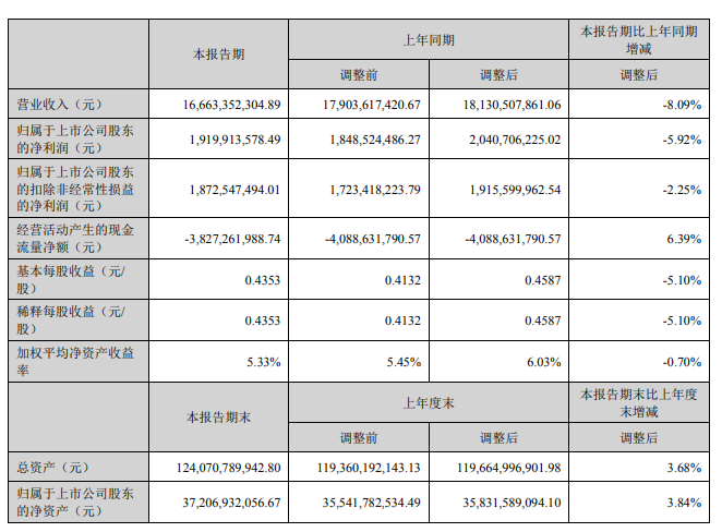 報告期內,公司實現營業收入人民幣1,666,335.23萬元,同比下降8.09%;實現歸屬母公司凈利潤人民幣191,991.36萬元,同比下降5.92%。