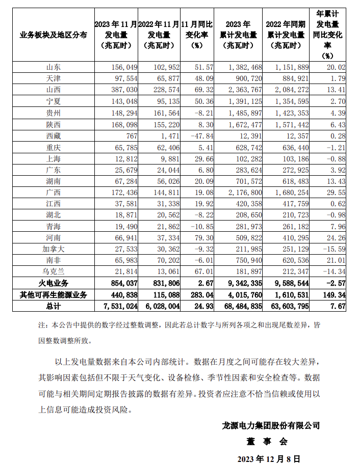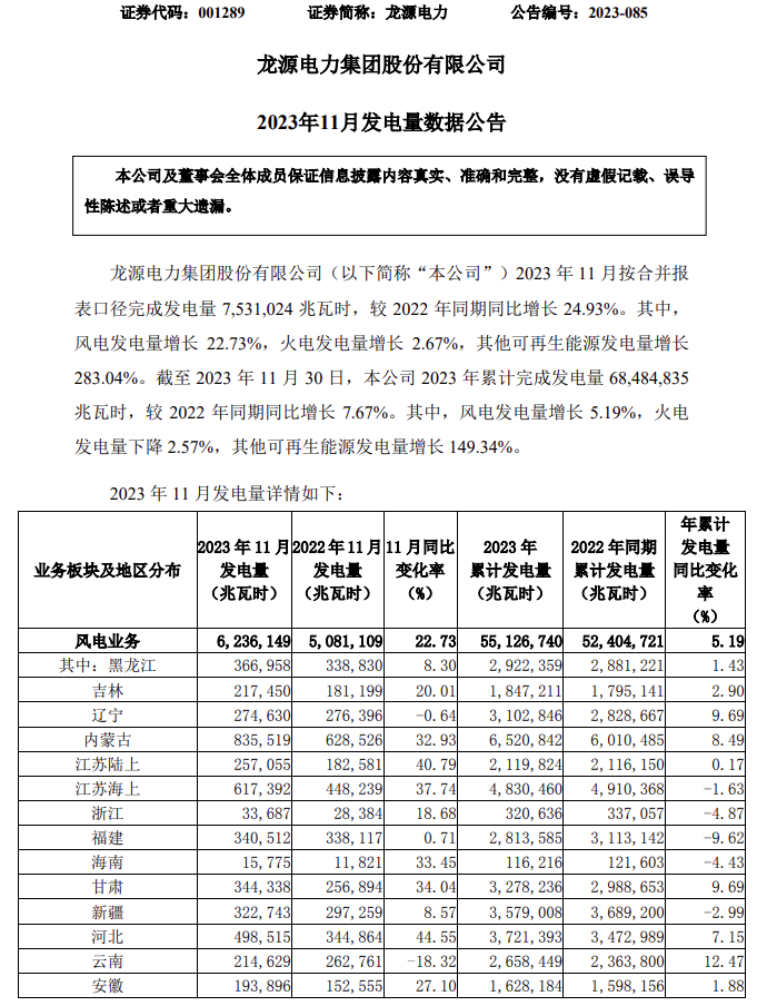 12月8日,龍源電力發(fā)布2023年11月發(fā)電量數(shù)據(jù)公告。