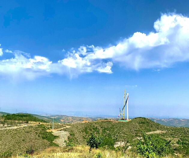 槐花香時麗日晴,風起平定山光新。6月6日,由中國能建投資建設、山西院總承包、山西電建承建的山西平定100兆瓦風電項目順首臺風機吊裝任務完成。這是一次非同尋常的吊裝。平定風電項目建設容量100兆瓦,安裝40臺海裝2.5兆瓦風機,機位大多分布在風場各獨立山頭上,施工區域海拔高、范圍廣、吊裝難度大。