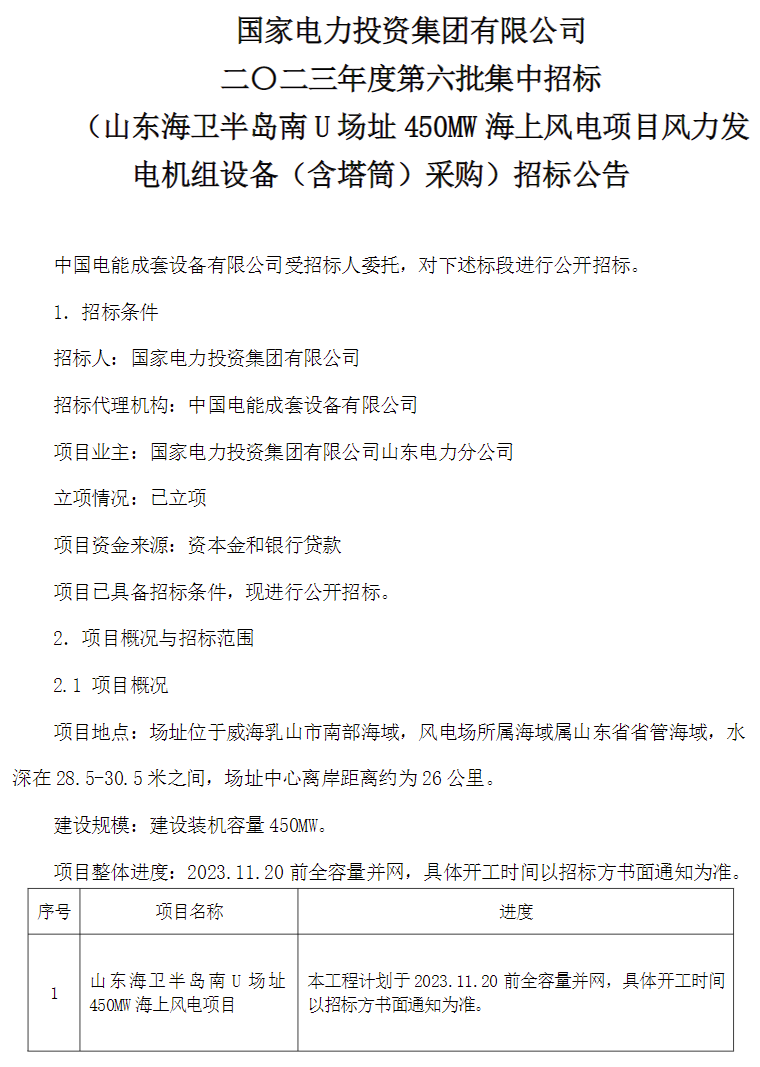 近日,國家電力投資集團有限公司發布二〇二三年度第六批集中招標(山東海衛半島南 U場址 450MW海上風電項目風力發電機組設備(含塔筒)采購)招標公告,規模共計450MW,單臺機組容量要求 8.5MW及以上。