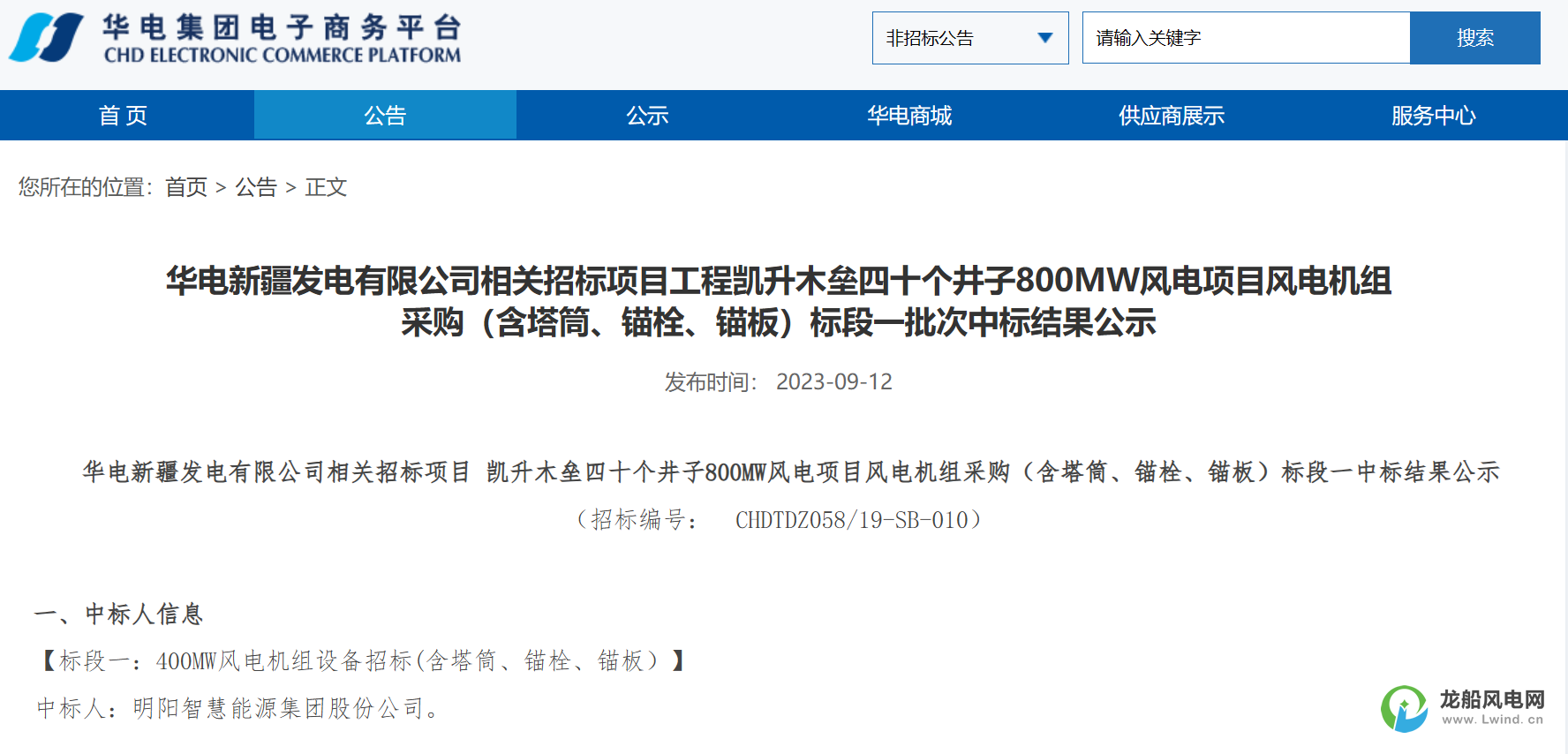 9月12日,華電集團電子商務平臺發布華電新疆發電有限公司相關招標項目凱升木壘四十個井子800MW風電項目風電機組采購(含塔筒、錨栓、錨板)標段一、標段二中標結果公示的公告。