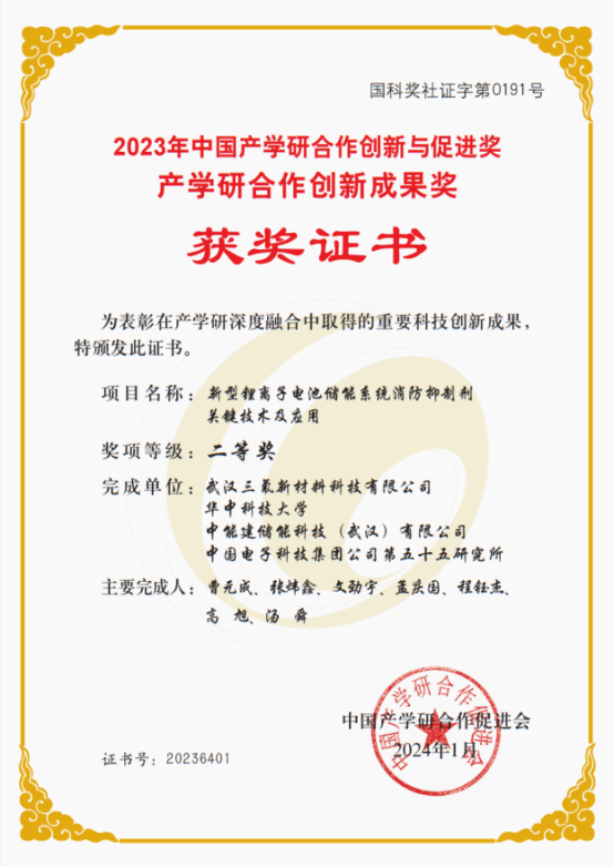 近日,第十五屆中國產(chǎn)學(xué)研合作創(chuàng)新大會在北京舉行。中能建儲能科技(武漢)有限公司與武漢三氟新材料科技有限公司、華中科技大學(xué)、中國電子科技集團(tuán)公司第五十五研究所等單位合作的“新型鋰離子電池儲能系統(tǒng)消防抑制劑關(guān)鍵技術(shù)及應(yīng)用”榮獲2023年中國產(chǎn)學(xué)研合作創(chuàng)新與促進(jìn)獎–產(chǎn)學(xué)研合作創(chuàng)新成果獎二等獎。