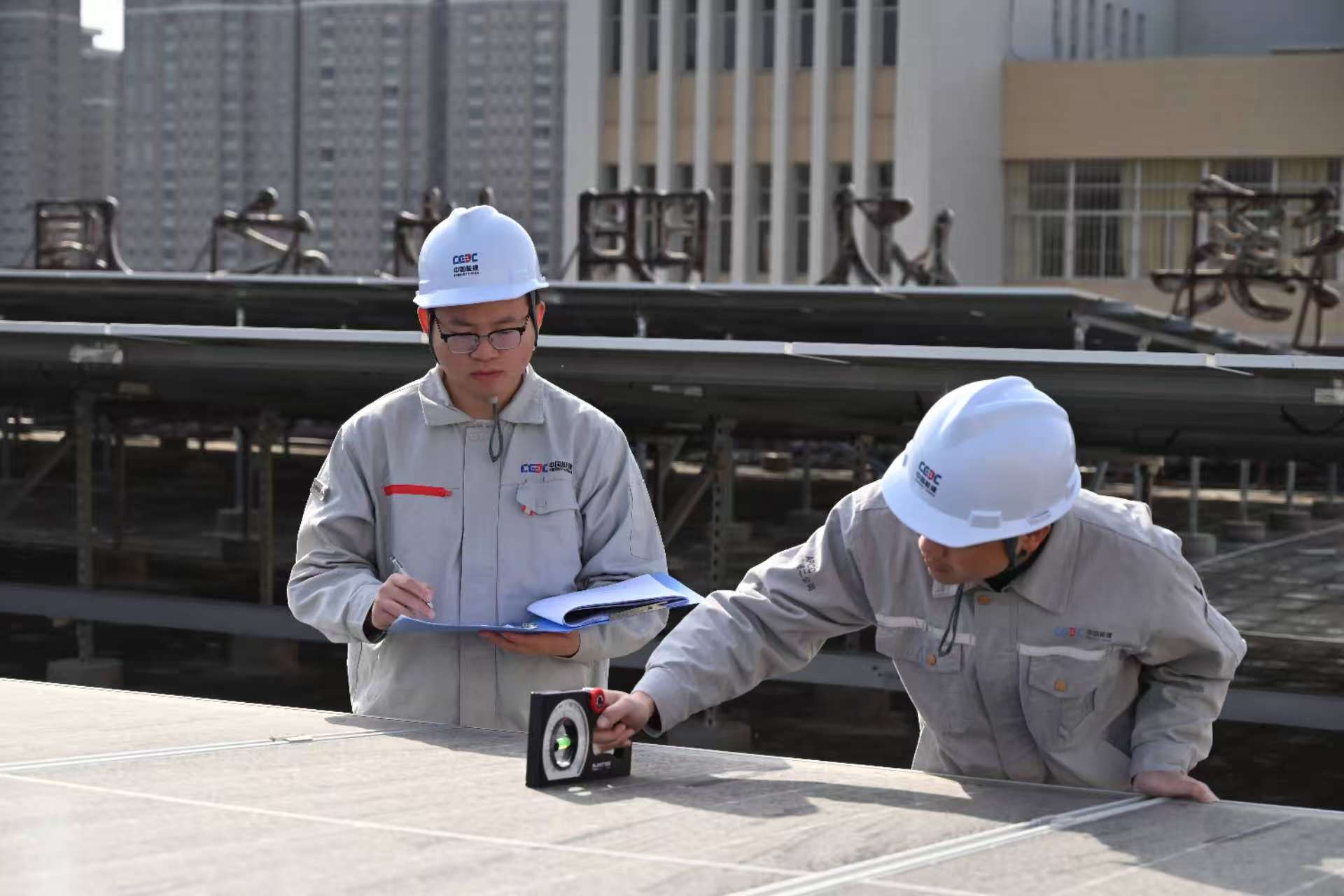 屋頂上的藍色光伏板在陽光下熠熠生輝,職工們穿梭在屋頂上,在光伏板的連接部位細致檢查,從腳板安裝到組件螺絲堅固,不放過任何一個可能存在的隱患;在交流側線路旁,技術人員對照著圖紙,一絲不茍地進行布線工作,每一個動作都嫻熟而沉穩。