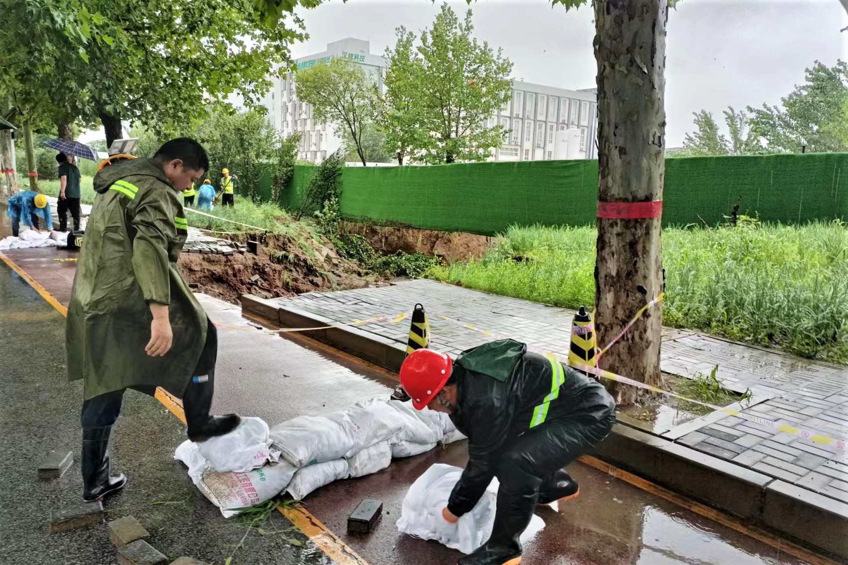 7月31日上午,在河北固安,中鐵二十局固安空港新城項目的團隊在接固安縣工業園區請求后,立即組織人員、物資設備等對已經發生道路坍塌的迎賓路進行圍擋作業,接續開展險情處置、助力恢復生產生活秩序,努力將暴雨影響降至最低。