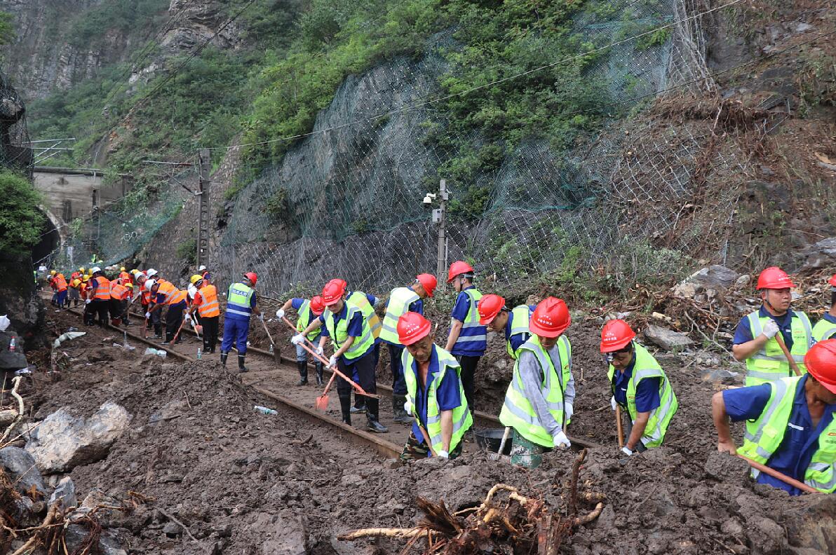 7月30日,受北京特大暴雨影響,三輛列車受困停靠在北京門頭溝妙峰山鎮山區。由于交通完全阻隔,災情仍在持續,現場救援刻不容緩。8月1日晚上9點半,接上級通知,中鐵十四局京唐、石港、雄商、雄忻、津滄等北京周邊項目共275人連夜趕赴北京門頭溝搶險一線,搶修被山體沖刷的淤泥、樹根、巨石覆蓋的鐵路路基,為受困列車旅客拉通逃生通道。