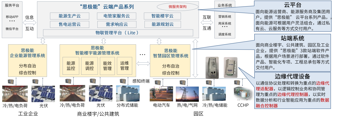 “思極能”站端軟件具備多能監控、分析、優化、調控等一站式綜合能源服務,實現對分布式光伏、儲能、空調、供暖、制冷、照明、給排水等狀態的信息采集、環境感知與系統控制,通過AI算法挖掘和智能決策,優化客戶側能源系統運行策略,保障能源供給,降低用能成本,履行雙碳承諾。